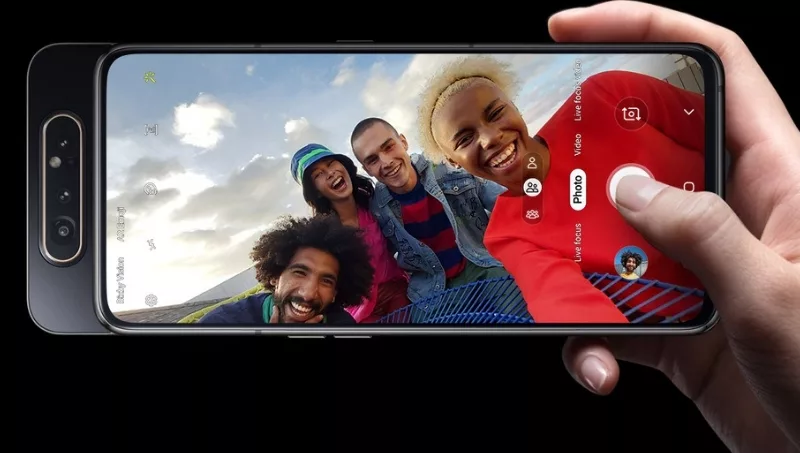 El principal atractivo de este celular es que posee un mecanismo diferente al contar con una cámara fotográfica triple giratoria que funciona a la vez como cámara frontal, y presenta una lente principal de 48 MP, un ultra gran angular de 8 MP y 123° más otra 3D para marcar la profundidad. Cuenta con una pantalla super AMOLED es de 6.7 pulgadas con una resolución Full HD+ de 1.080 x 2.400 píxeles y procesador Snapdragon 7150 de 8 GB RAM, mientras que su almacenamiento es de 128 GB. La batería del A80 es de 3.700 mAh y carga rápida de 25W además del lector de huella.