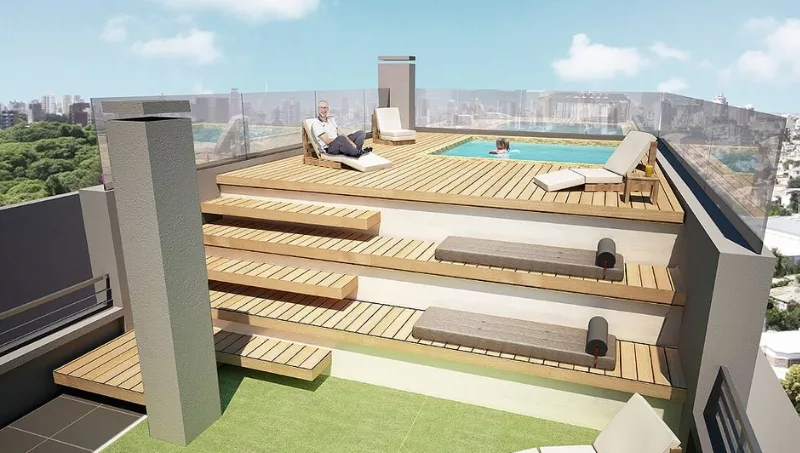 Villa Magna ofrece a sus residentes espacios de uso común en la azotea (piscina y parrilleros) y cocheras opcionales en el subsuelo. Además, el hall de acceso en planta baja tiene recepción y habrá sistema de seguridad CCTV. Lo más importante: será pet friendly.