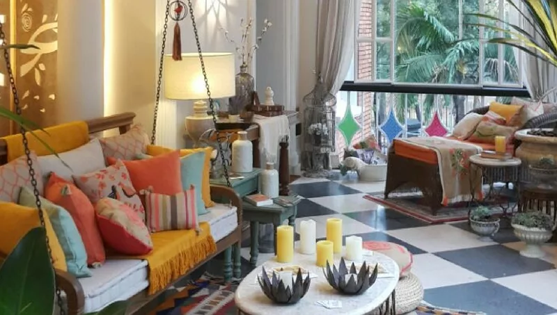 Para esta intervención se tomó elementos del clásico porche americano y se trasladó al imponente balcón, ubicado en la segunda planta de la exposición CasaCor. Aquí se destacan un clásico sofá-columpio suspendido desde el techo, un sillón-hamaca y una tumbona de ratán. Bordados, tallas, calados y el universal símbolo de la Rosa de los Vientos, se unen para exaltar los sentidos y rememorar el espíritu de esta fantástica mansión de añejos tiempos.