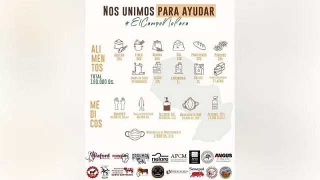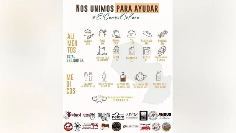 “Se trata de una campaña organizada por todas las asociaciones de criadores de raza que están nucleadas en la Asociación Rural del Paraguay (ARP), con la intención de ayudar a aquellos que más están necesitando. Consensuamos que cada asociación a través de los socios y amigos aportará dinero, que luego será destinado a la compra tanto de kits de alimentos como de insumos hospitalarios”, explicó Oliver Ferreiro, presidente de la Asociación Paraguaya de Criadores de Braford (APCB).