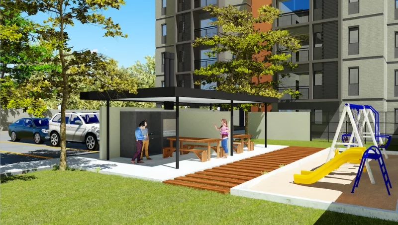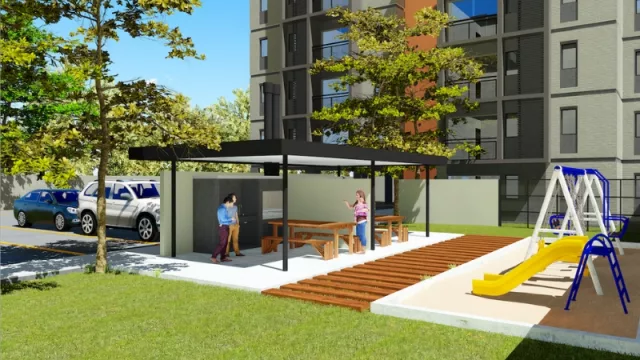 El edificio cuenta con acceso controlado, portero eléctrico, estacionamiento para las unidades, área verde de expansión, parque con juegos infantiles de mínimo mantenimiento y quinchos con parrilla. Además, tiene dos ascensores de última generación con terminaciones de acero inoxidable.