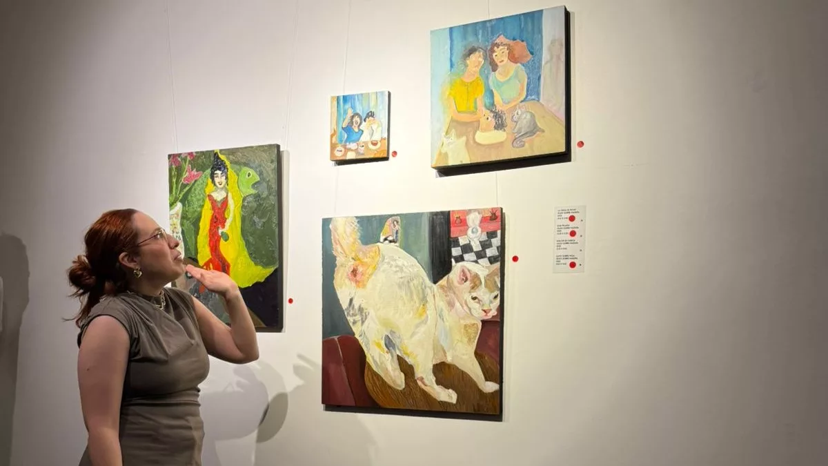 Los cuadros, vibrantes y luminosos, están construidos a partir de una paleta dominada por amarillos, lilas, azules y tonos cálidos, potenciados por la naturaleza brillante del óleo. En sus composiciones conviven escenas domésticas, personajes caricaturizados, gestos exagerados y elementos simbólicos que revelan una capa más profunda. Entre ellos aparecen calaveras, cuerpos fragmentados y guiños a la muerte: un recordatorio de que toda celebración lleva consigo una sombra. “Las dinámicas familiares son divertidas, pero también hay secretos, duelos no resueltos y cosas que incomodan”, afirmó.