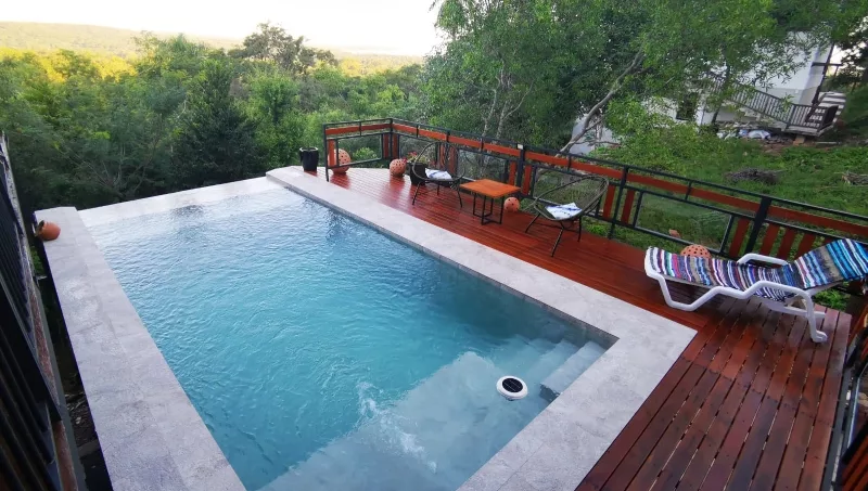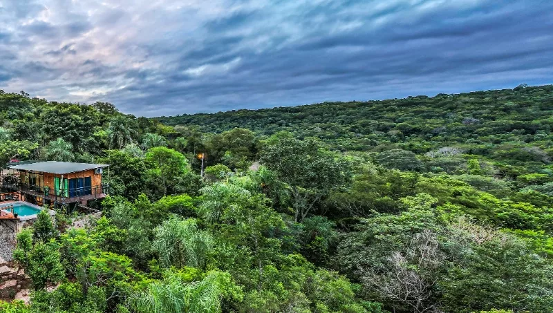 El espacio interior se completa con una sala comedor y kitchenette, mientras que en el exterior cuenta con quincho, una terraza con mirador, y una piscina elevada con asiento mirador y borde infinito. Los espacios para disfrutar del paisaje al aire libre con hamacas, mesas y sillas, tanto en el patio inferior como en la terraza de planta alta, hacen de este lugar el ideal para un fin de semana de relax.