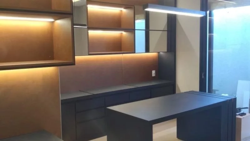 “Manejamos varios materiales, lo cual nos da la posibilidad de ofrecer una infinidad de opciones a nuestros clientes. Contamos con melaminas lisas, melaminas texturadas, melaminas fenólicas (antihumedad), melaminas brillantes, madera placa carpintera, madera enchapada, madera tablero de paraíso, madera tablero de cedro, madera tablero de trébol, laqueados poliuretanicos, lustrados nitrocelulosos, laminados HPL (fórmica), vidrio y aluminio, granito natural, mármol natural, quarzo (Silestone, JBC y Compac), solid surface (Tresol), porcelánico (Dekton y Neolith) y acero Inoxidable”, destacó López.