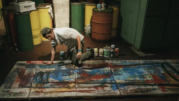 En esta oportunidad, Guille Sanabria fue el encargado de las intervenciones artísticas con técnicas libres y abstractas sobre lienzos, realizados en el imponente marco de la antigua fábrica de hilados y tejidos La Nacional Genovese.