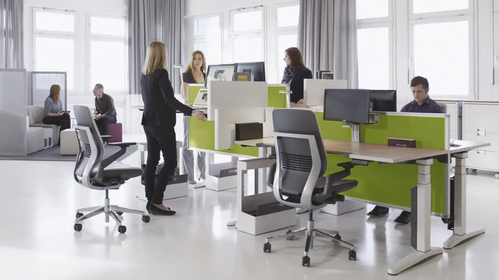 La línea de mesas de oficina está diseñada para la creación de espacios modernos y funcionales con mesas flexibles, ligeras, adaptables de fácil configuración. Asimismo, Steelcase cuenta con unos escritorios ajustables en altura que permiten a los trabajadores cambiar de posición fácilmente, desde estar sentado hasta estar de pie, durante el día, lo cual puede impactar positivamente su salud física.