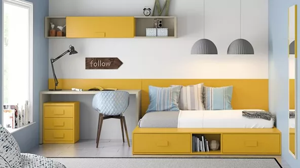 También se pueden elegir los mobiliarios en función al color. Si preferimos un escritorio que no vaya integrado con el resto de los muebles del dormitorio, una buena idea será la de optar colores distintos para diferenciar los diferentes espacios. Por ejemplo: el armario, la cama y demás que sea de un color, y por otro lado un escritorio que sea de otra tonalidad distinta para marcar los sectores.