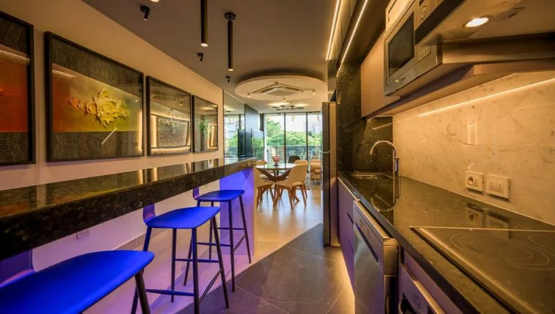 Las unidades presentan una cuidada selección de materiales de alta gama, donde destacan los pisos de porcelanato de gran formato, que confieren elegancia y durabilidad. Los baños exhiben revestimientos de porcelanato de gran formato, complementados con espejos en las paredes y encimeras de granito natural, mientras que la cocina se distingue por sus encimeras de granito natural y revestimientos de mármol de Carrara. “Se priorizó el máximo aprovechamiento del espacio, proporcionando amplias capacidades de almacenamiento a través de placares y muebles de cocina que alcanzan la altura del cielorraso. Además, se garantiza el confort térmico con equipos de aire acondicionado tipo Split de pared en las habitaciones y tipo casete en la zona social del departamento”, detalló la arquitecta.