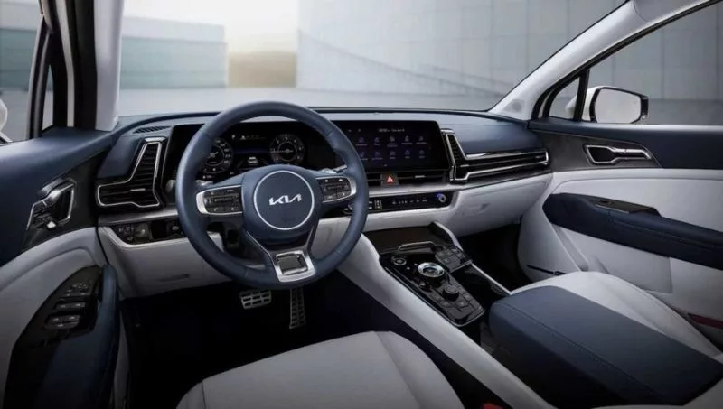 El interior es más limpio, minimalista, tecnológico y elegante, con detalles ya vistos en el nuevo Kia K8. Se destaca por lo llamativa la gran pantalla curva en el tablero, que une el cuadro de instrumento digital con el sistema de infoentretenimiento.