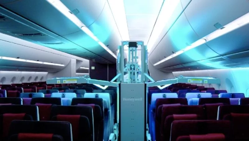 Aproximadamente del tamaño de un carrito de bebidas, el sistema de cabina UV de Honeywell, operado por Qatar Aviation Services (QAS), tiene brazos UV extensibles que tratan los asientos, las superficies y las cabinas de los aviones sin utilizar productos químicos.