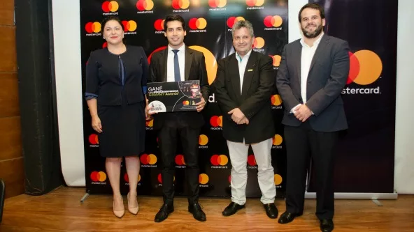 Emocionado, Andrés Vera recibió su premio de la mano de representantes de Bancard y Procard, en un acto realizado en Biedermann Publicidad, del cual también participaron representantes del Banco Continental.