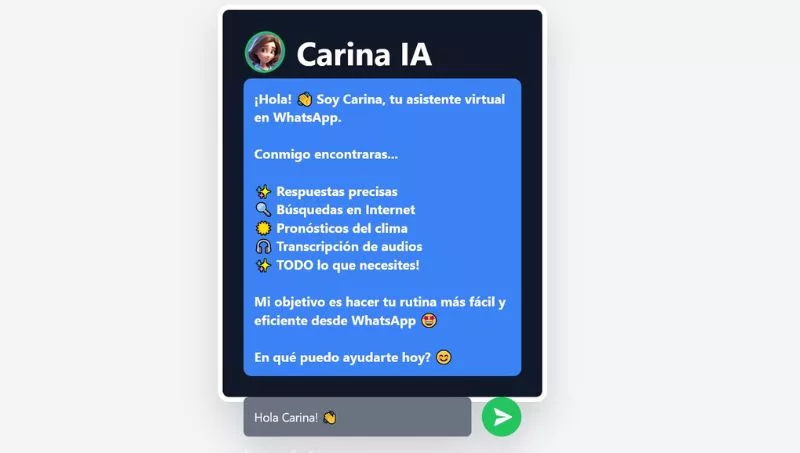 Se trata de Carina IA, un asistente virtual con las mismas capacidades que otras IA como ChatGPT, pero que se diferencia en que la primera está integrada en WhatsApp. Funciona como un chat más, o sea, un contacto tradicional, lo que facilita la conversación con ella y siempre está a mano para ayudar.