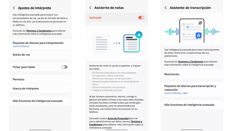 En total, la IA se aplica en: llamadas, con traducción simultánea y en tiempo real; Teclado Samsung, que permite traducir mensajes y optimizar la escritura, tanto en tono como en ortografía y gramática; Intérprete, para traducir audio o texto; Samsung Notes, que con la IA es posible formatear, resumir, corregir ortografía y traducir notas; Asistente de transcripción, que posibilita pasar a texto los audios de grabación, además de resumirlos y traducirlos; Edición generativa, con lo cual es posible borrar objetos, mover personas de lugar o cambiarlas de tamaño, rellenar fondos, entre otras tantas opciones para salvar y corregir tomas. Todo este proceso se vuelve aún más preciso con la ayuda del S Pen.