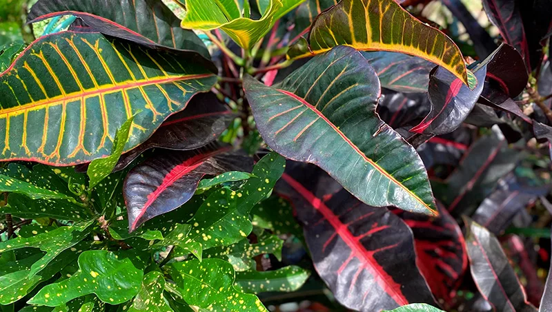 Planta de hojas grandes y vistosas, con colores variados que van del verde al rojo y amarillo. Ovelar explicó que esta especie requiere estar expuesto directamente al sol y riego moderado.