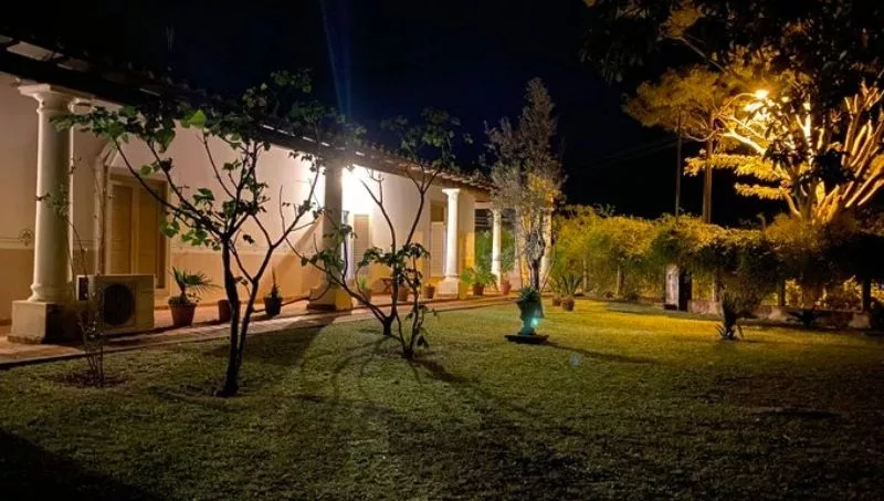 Fuera de la casa cuenta con dos baños suplementarios, y en alrededor de 2.000 m2 hay una huerta, una zona de árboles frutales, jardines, parrilla, estacionamiento, varios lugares con bancos y hamacas para sentarse a leer o tomar mate, entre otras formas en las que las familias o grupos de amigos pueden disfrutar de este lugar.