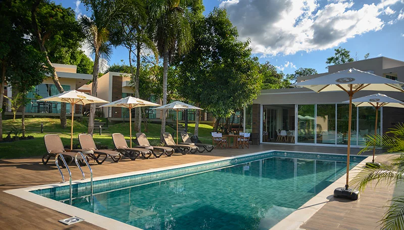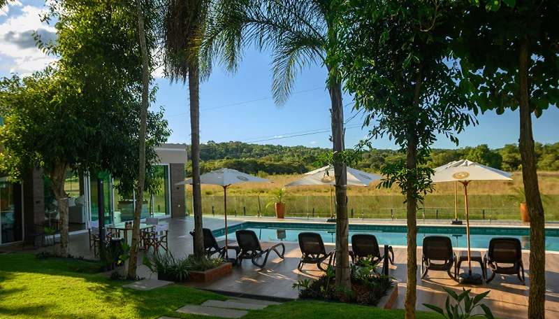 El hotel, situado frente al histórico arroyo Yhaguy (agua que corre bajo sombra), ofrece 13 habitaciones diseñadas para proporcionar una experiencia de confort y relajación. Cada habitación cuenta con baño en suite, microondas, frigobar, televisión, wifi, aire acondicionado y un acogedor balcón que invita a disfrutar del paisaje circundante.