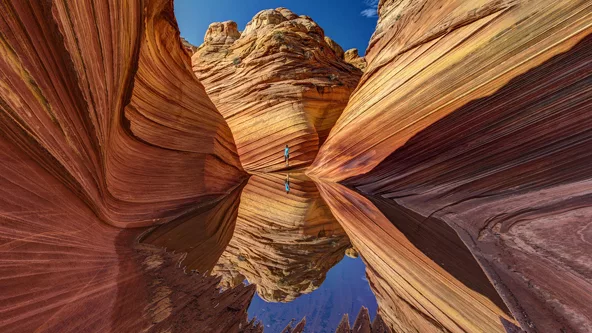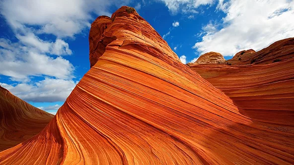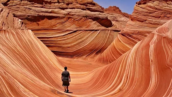 The Wave es un lugar famoso entre fotógrafos y excursionistas. Un paisaje de formas onduladas a modo de “ola” y colores anaranjados y rojizos. Según se cree, originariamente era un conjunto de dunas que con el paso del tiempo se transformaron en roca sólida.