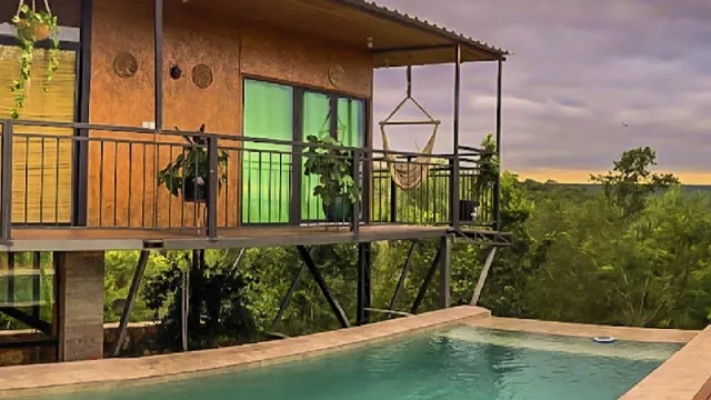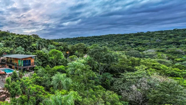 El espacio interior se completa con una sala comedor y kitchenette, mientras que en el exterior cuenta con quincho, una terraza con mirador, y una piscina elevada con asiento mirador y borde infinito. Los espacios para disfrutar del paisaje al aire libre con hamacas, mesas y sillas, tanto en el patio inferior como en la terraza de planta alta, hacen de este lugar el ideal para un fin de semana de relax.