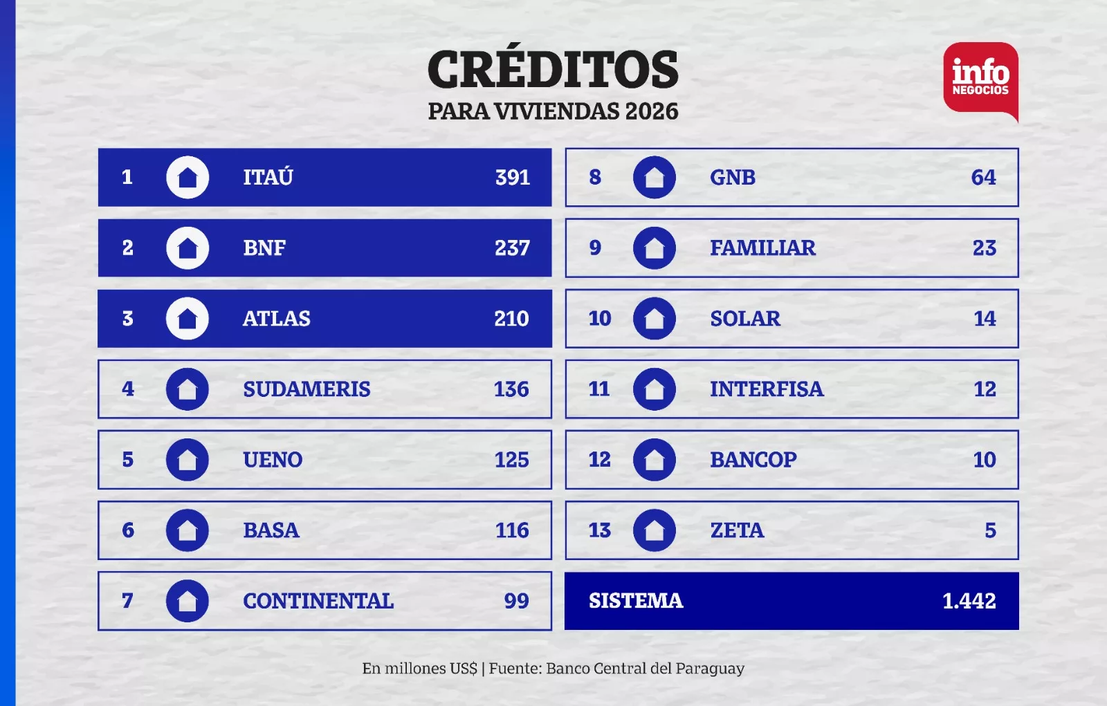 Desde ueno bank, Diego Duarte, director titular de la entidad, detalló que el año estuvo marcado por una fuerte tracción de los préstamos vinculados al programa Che Róga Porã. De acuerdo con los datos del Boletín Estadístico del BCP, la cartera de créditos para la vivienda de la entidad movió cerca de US$ 125 millones al cierre del año pasado, creciendo 38%.