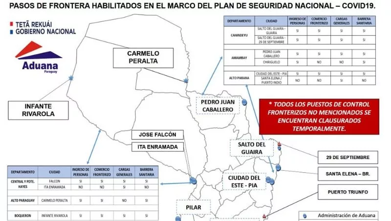 En total son 13 los pasos fronterizos habilitados: Aeropuerto Internacional Silvio Pettirossi, Puerto José Falcón, Paso Yacyretá (Misiones), Puente San Roque González Santacruz (Encarnación), Puerto Triunfo (Itapúa), Puente de la Amistad (Ciudad del Este), Aeropuerto Guaraní (Minga Guazú), Barrio 29 de Septiembre (Salto del Guairá), Pedro Juan Caballero, Concepción, Carmelo Peralta, Infante Rivarola (Boquerón).