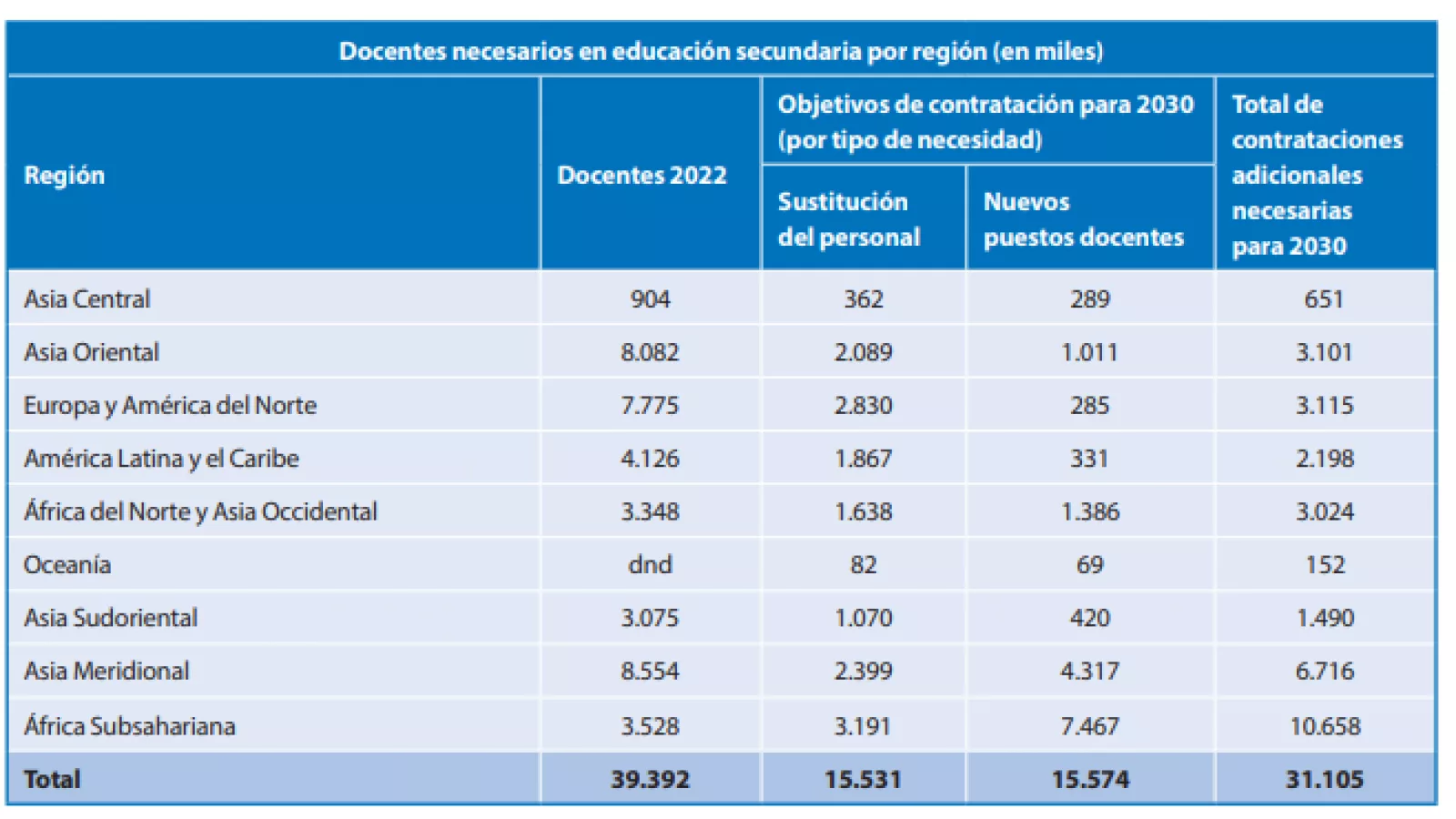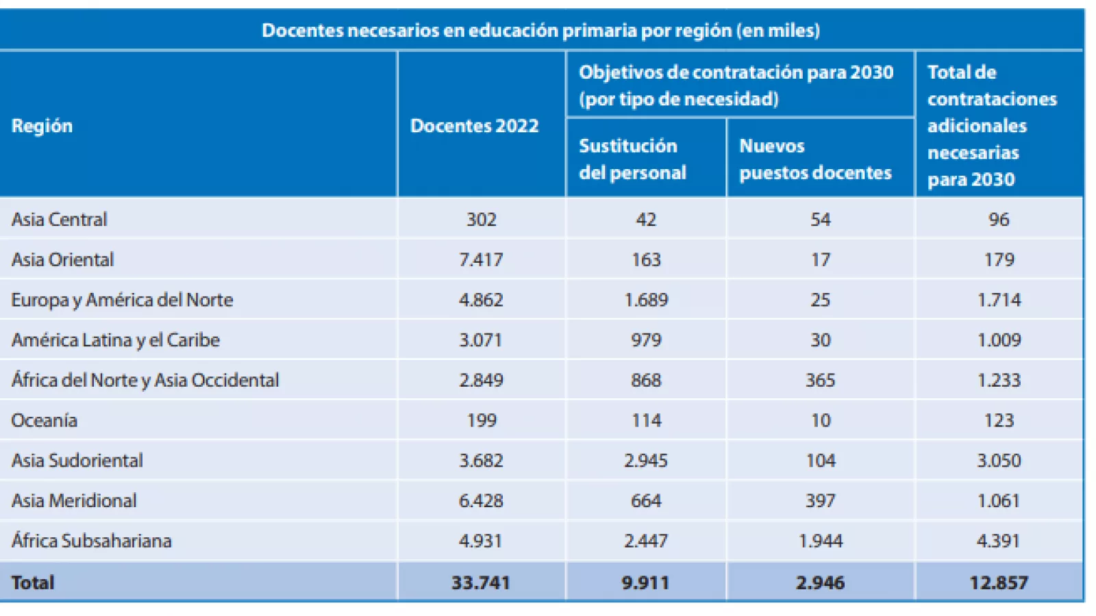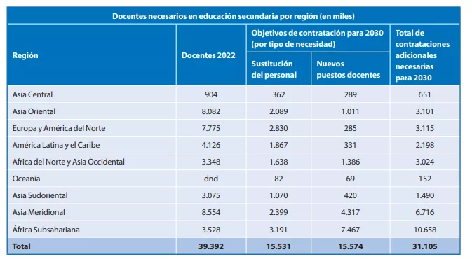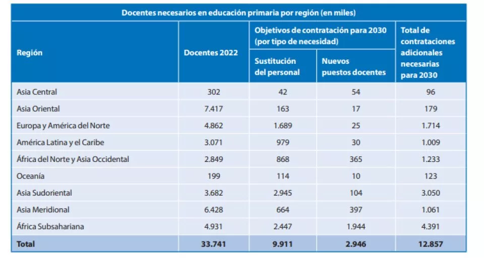 A nivel mundial se necesitan 13 millones de docentes para cubrir la educación primaria universal y 31 millones para el nivel secundario. Latinoamérica y el Caribe demandan para el 2030 más 3.2 millones profesionales para la educación primaria y secundaria. Mientras que la mayor carencia de docentes se encuentra en África Subsahariana, donde faltan más de 15 millones educadores primarios y secundarios. En Asia Central, en cambio, la necesidad es menor, puesto que demanda a cubrir es menor a 750.000.