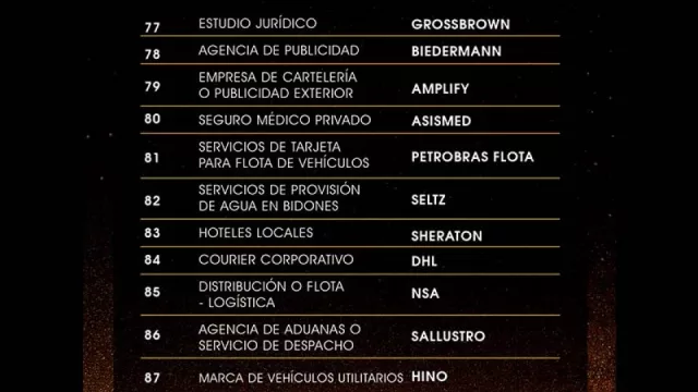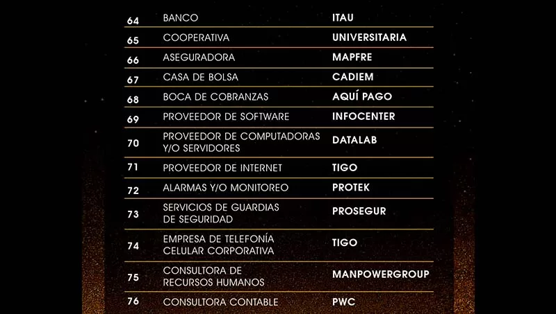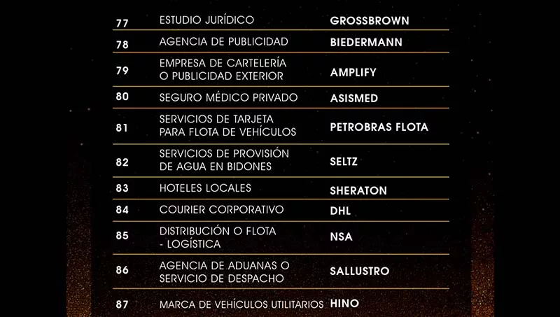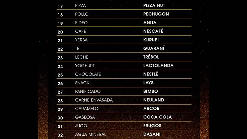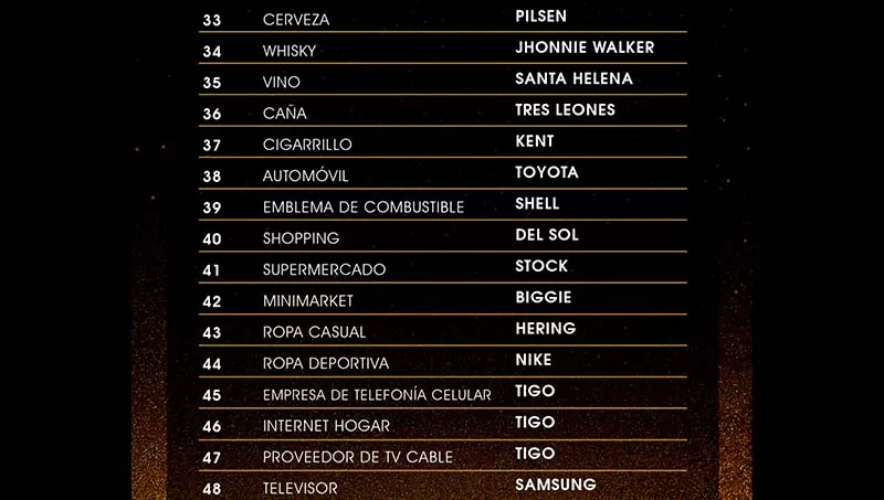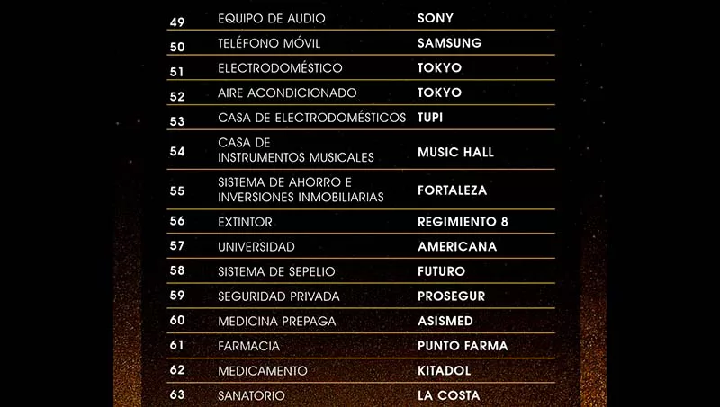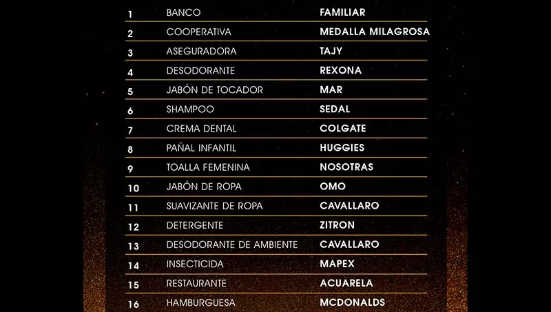 Las marcas ganadoras fueron divididas en 18 categorías como: bancos, cooperativas, seguros, higiene personal, limpieza del hogar, gastronomía, automotriz, electrónica y electrodomésticos, tecnología, consultoría, bebidas, entre otras. Se repartieron, 87 estatuillas a las empresas participantes, distinguidas cada una en sus categorías.