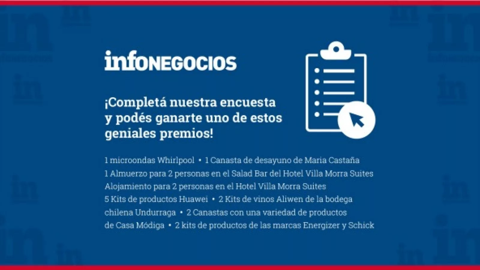 Es por eso que Infonegocios lanza una entretenida encuesta para conocer el perfil de sus lectores. Y como entendemos que tu tiempo es muy valioso, premiaremos tu interés con increíbles premios como: kits de productos de la marca Huawei, Microondas Whirlpool, un almuerzo para dos personas en el Salad Bar del Hotel Villa Morra Suites, alojamiento para dos personas en el Hotel Villa Morra Suites, una Canasta de desayuno de Maria Castaña, variedad de productos de Casa Módiga, Kits de vinos Aliwen de la bodega chilena Undurraga y kits de productos de las marcas Energizer y Schick.