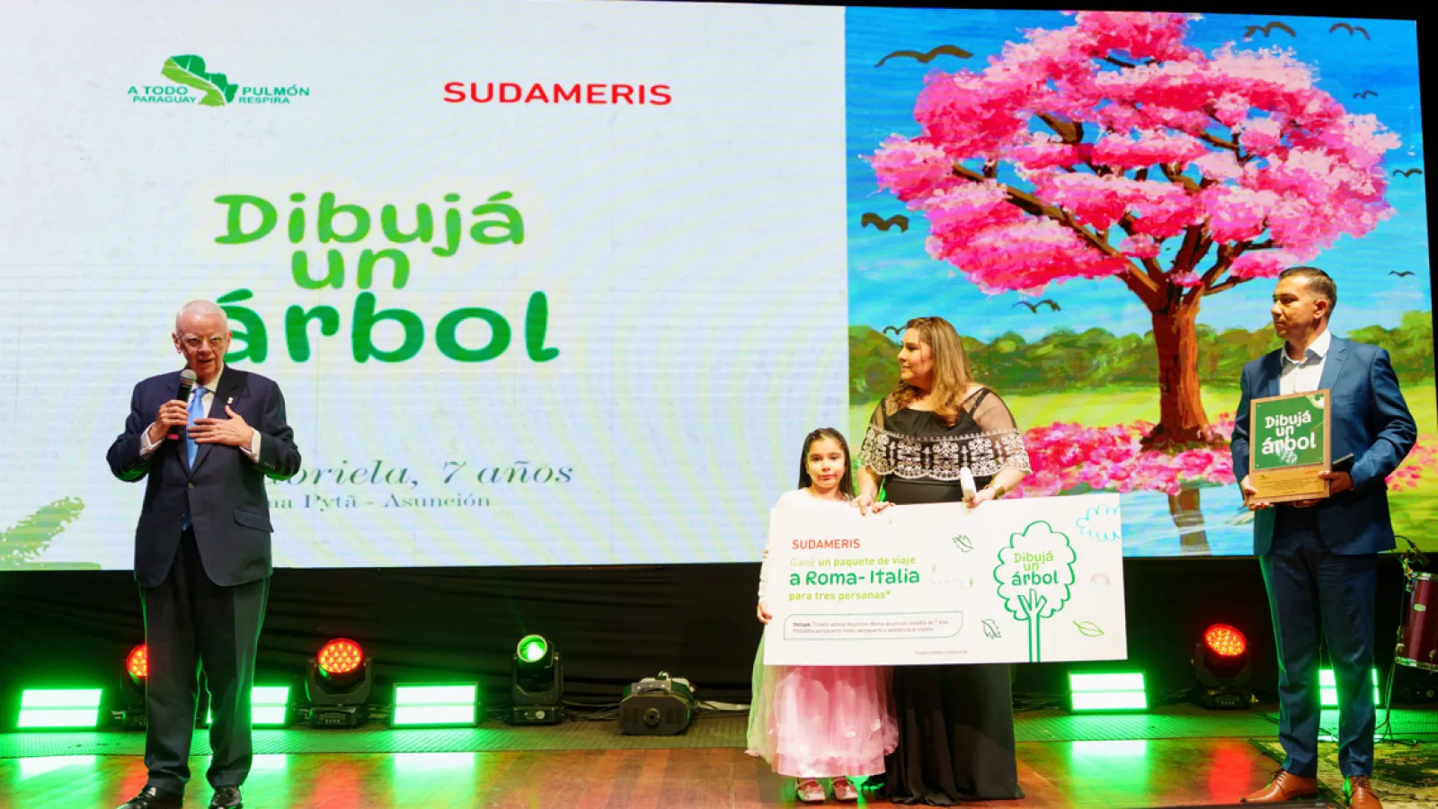 La premiación se realizó durante la tradicional Cena de Gala Humberto Rubin de la organización A Todo Pulmón Paraguay Respira, llevada a cabo con auspicio de Sudameris. El premio mayor, un viaje con todos los gastos pagos a Roma para tres personas, fue entregado a Gabriela por Conor McEnroy, presidente de la entidad bancaria, quien también es miembro del directorio de A Todo Pulmón.