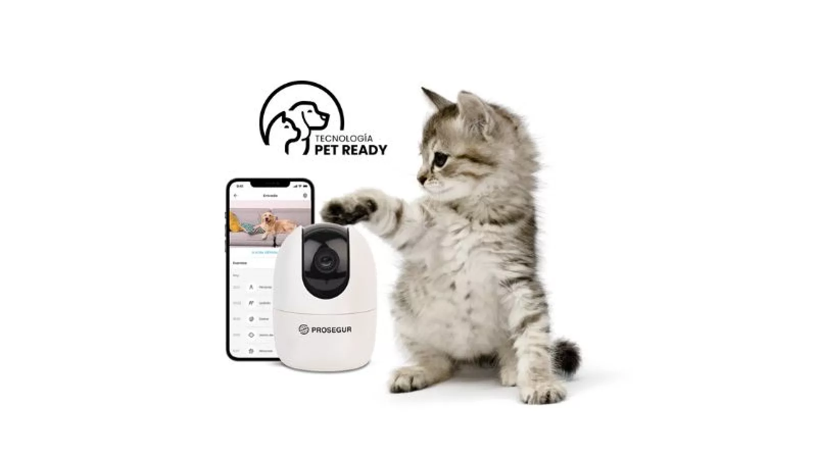 PetReady funciona con elementos de detección de intrusión que son compatibles con mascotas combinados con una cámara IP con grabación en la nube, que además permite interactuar con el animal, ya que cuenta con micrófono y parlante.