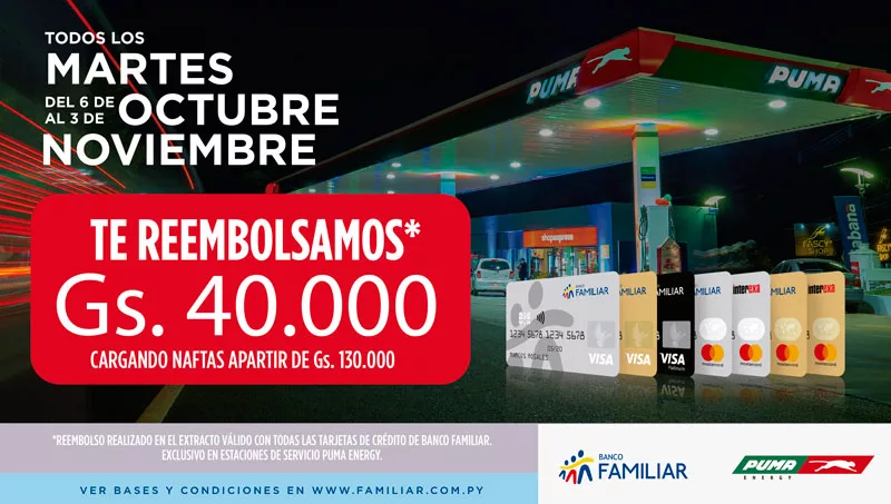 Todos los martes, aquellos clientes que carguen más de G. 130.000 en nafta y paguen con las tarjetas de crédito del Banco Familiar recibirán G. 40.000 de reembolso. El mismo se verá reflejado directamente en el extracto. El límite de reembolso es de G. 40.000 (guaraníes cuarenta mil) por tarjeta y aplica para todas las naftas comercializadas por Puma Energy. Esta promoción estará vigente desde el 6 de octubre hasta el 3 de noviembre.