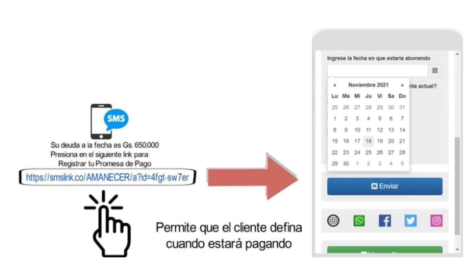 También es posible el envío de un mensaje de texto con la información detallada, lo que incluye un enlace personalizado, que abre una ventana donde el cliente define su fecha de pago.