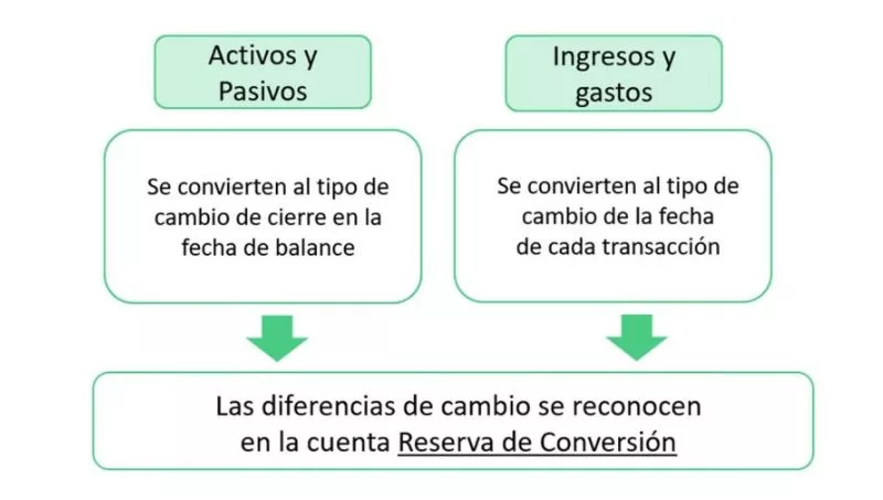 Como se observa en el esquema anterior, la nueva norma del Consejo de Contadores define y utiliza una nueva cuenta contable denominada “Reserva de Conversión” que debe ser expuesta en el patrimonio neto de la empresa y utilizada para la contabilización de las diferencias de cambio resultantes del proceso de traducción de los activos y pasivos expresados en la moneda funcional a un tipo de cambio unificado a la fecha de cierre del período y de los ingresos y gastos al tipo de cambio de la fecha de cada transacción.